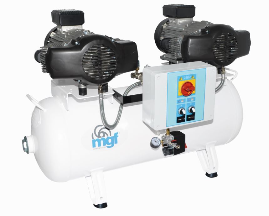 Oil free reciprocating air compressors with a compressed air FAD of 340 l/min @ 5 bar pressure. Receiver capacity 90 L, with internal surface treatment to protect against corrosion. This compressor is available also in 10 BAR VERSION, visit the appropriate section!