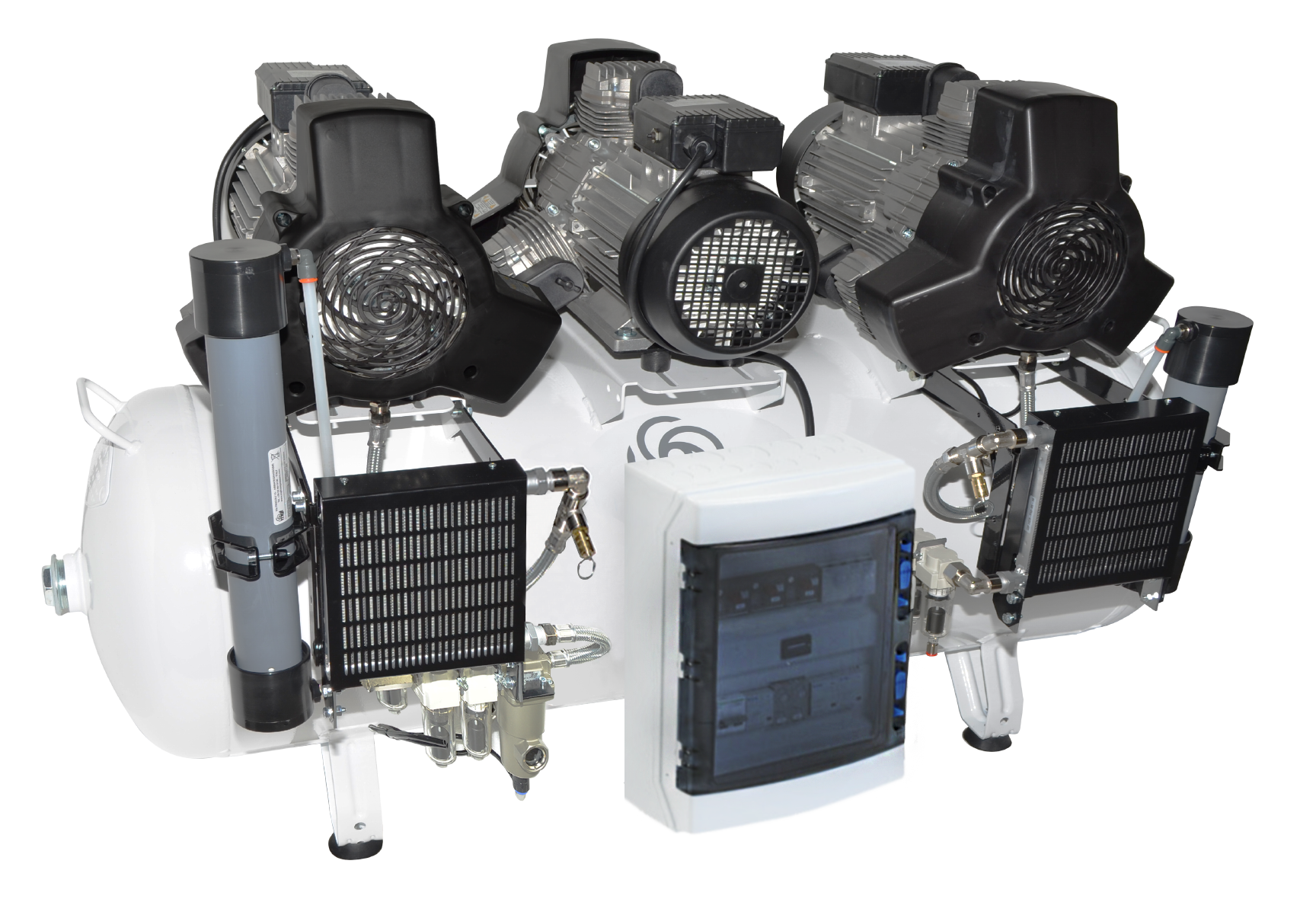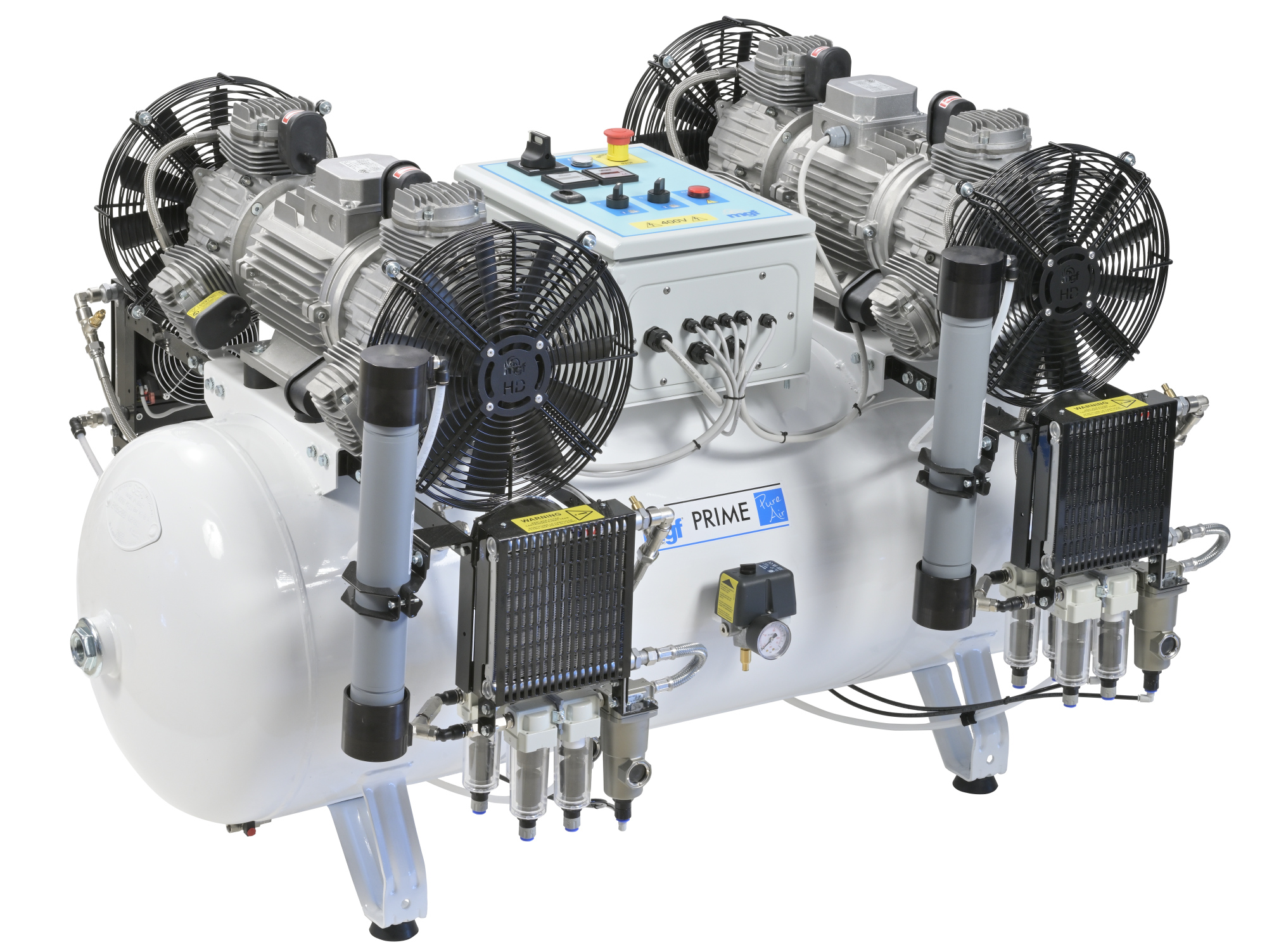 Oil free compressor for intensive duty cycle, 12 cylinders, air output 720 l/min@8 bar, 270 l tank, new generation membrane dryer capable of supplying dried air down to -20°C dew point. These models are 100% Duty Cycle and engineered with IoT (internet of Things) technology so that they can offer network-connected compressors and digital device monitoring services.