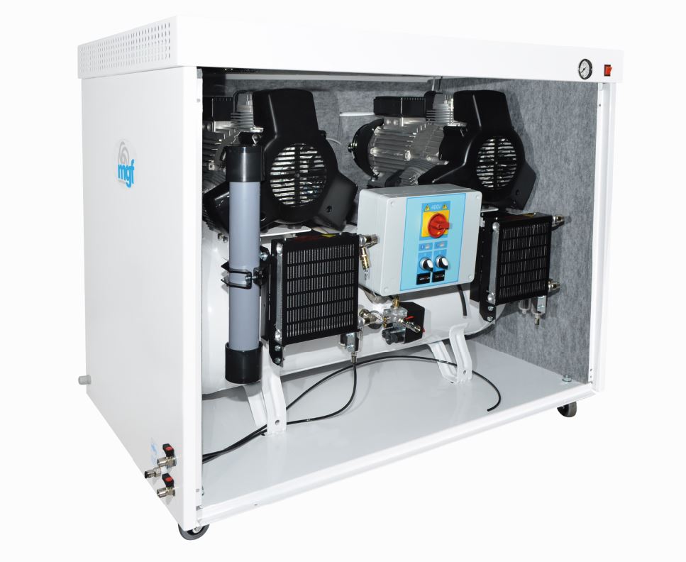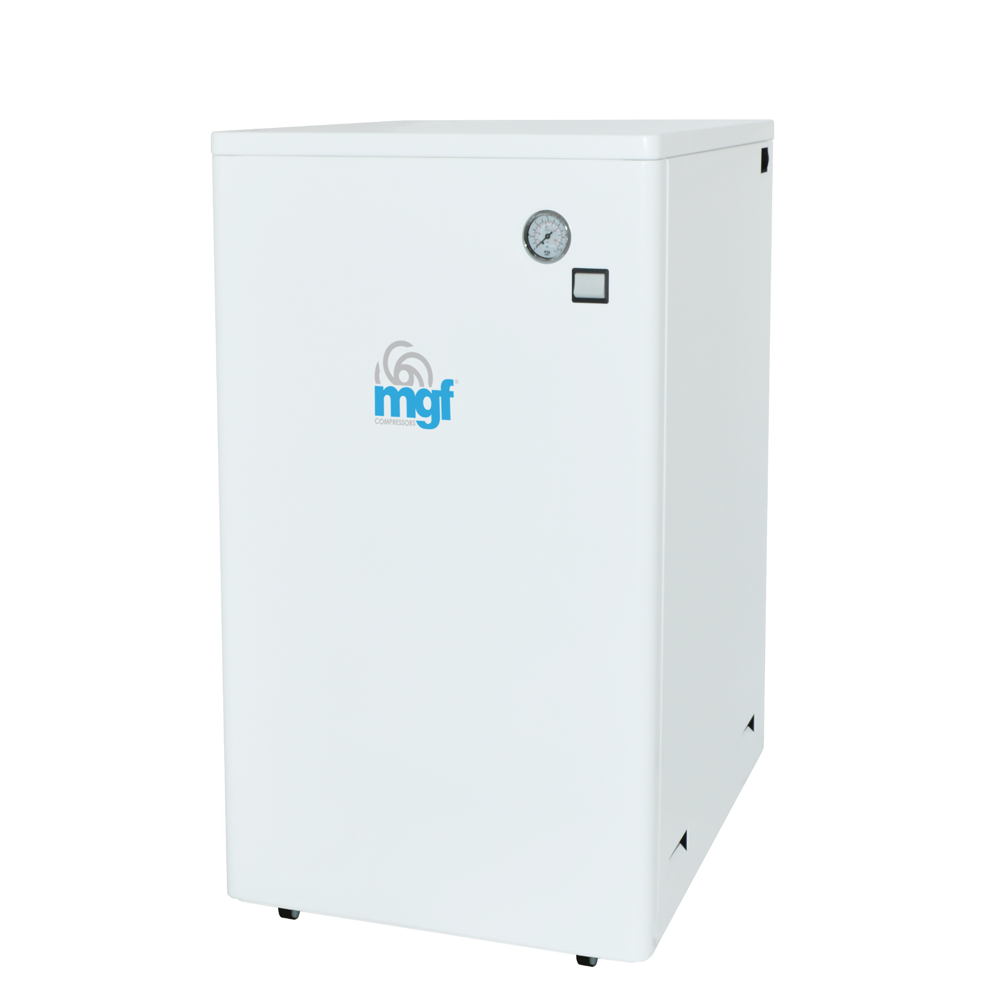 Oil free reciprocating air compressors with soundproof cabinet, compressed air FAD of 450 l/min @ 5 bar pressure. Receiver capacity 90 L, with internal surface treatment to protect against corrosion. Complete with membrane dryer to ensure maximum air purity. This compressor is available also in 10 BAR VERSION, visit the appropriate section!