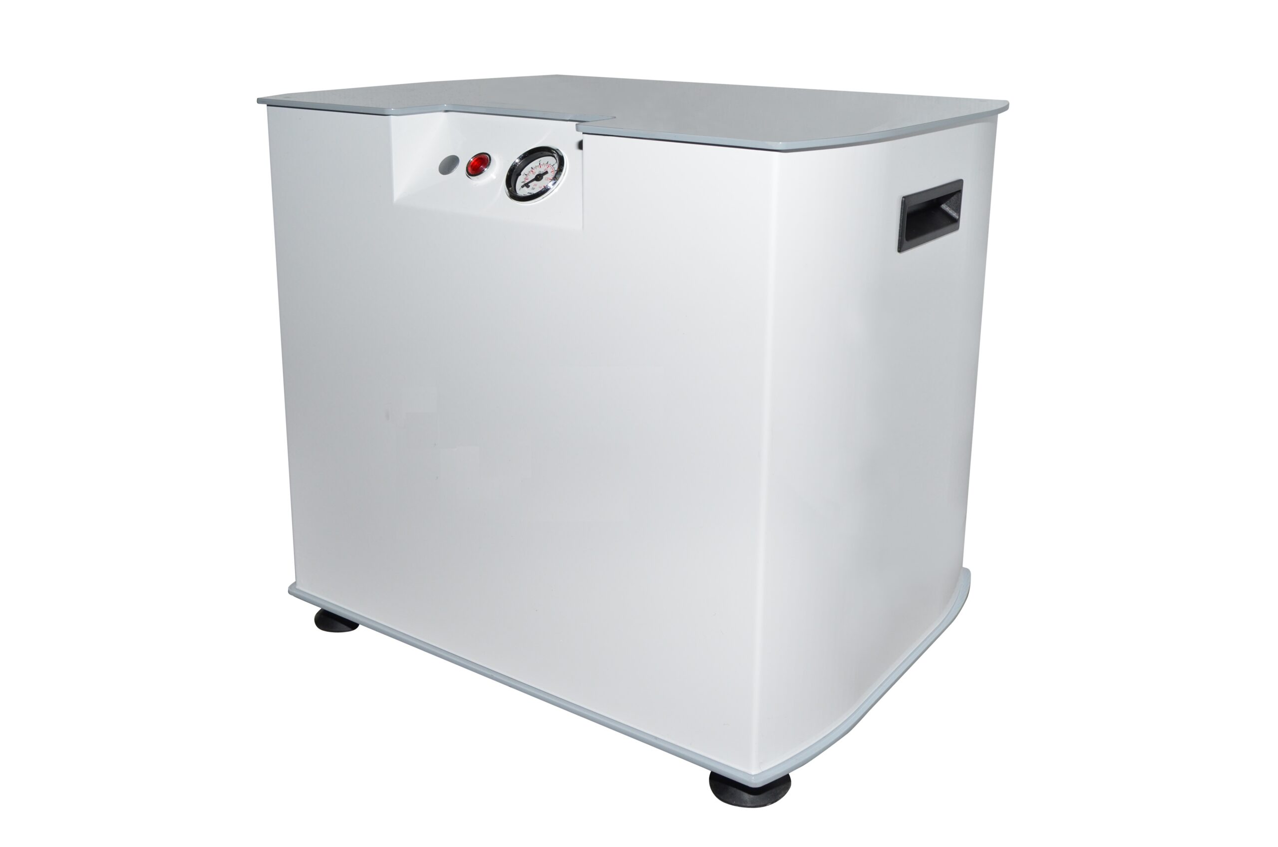 Twin cylinder super silent oil free compressor, dB 50/1m, 1400 rpm, maximum pressure 7 bar, 3 liter stainless steel tank and cooling system.