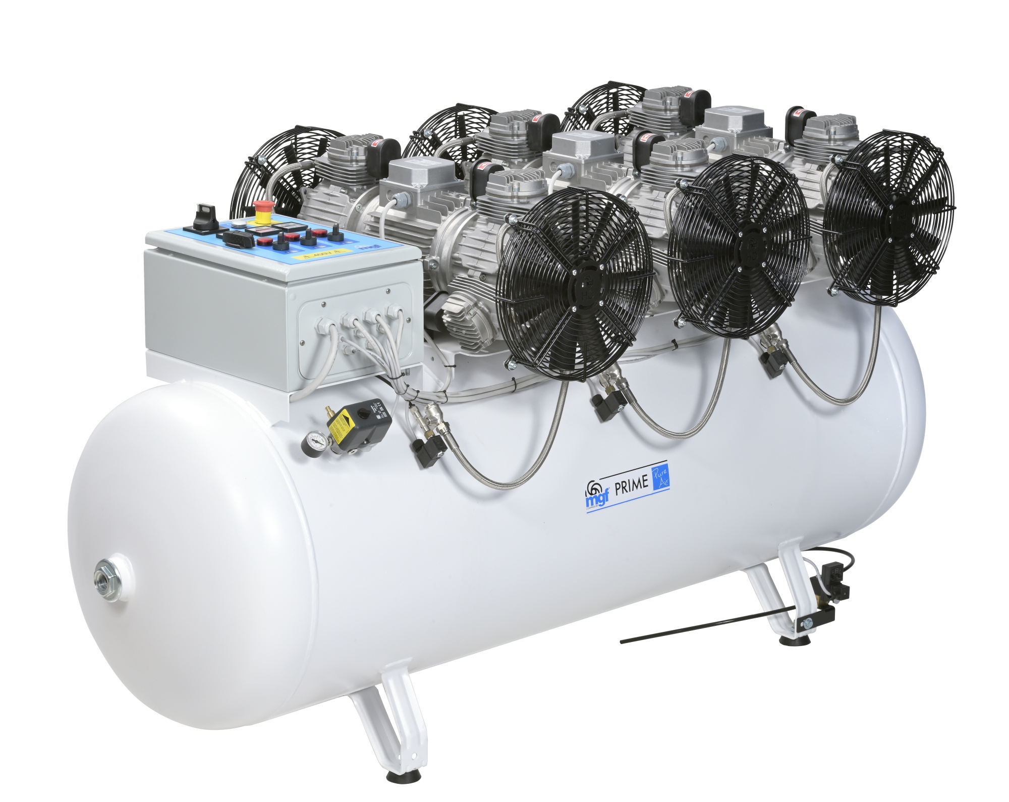Heavy duty cycle oil-free compressor, intake air 1140 l/min, air delivery at 10 bar 1,350 l/min, 500 l tank. The operation of the compressor is regulated by an electronic control unit installed directly on the compressor. The compressor is supplied without air filtration. These models are 100% Duty Cycle and engineered with IoT (internet of Things) technology so that they can offer network-connected compressors and digital device monitoring services.